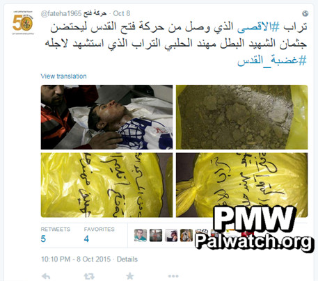 Fatah’s Twitter posts pictures of soil from the Al-Aqsa Mosque to be buried with terrorist "so that the dead body... can hug the soil for which he died a Martyr"