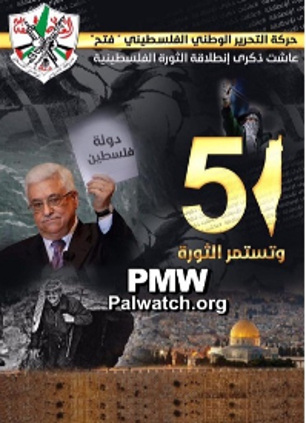 Palestinian Authority Chairman Mahmoud Abbas stands at attention in front of the PLO symbol, which places the Palestinian flag over the map of Israel. This symbolizes that all of Israel is, or will someday be, "Palestine." The picture is from the a PLO Central Committee meeting broadcast on PA TV.