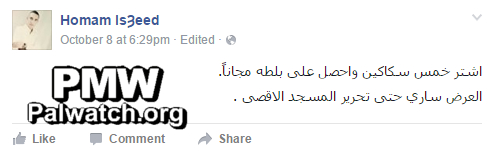 Posted text: “Buy five knives, get a free axe. Offer is valid until the liberation of the Al-Aqsa Mosque”