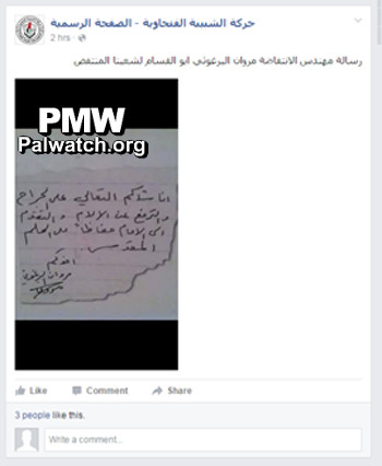 Posted text: “A letter from the engineer of the [second] Intifada Marwan Barghouti Abu Al-Qassam to our uprising (i.e., carrying out intifada) people”
