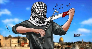Cartoon shows a masked man playing a knife as a violin, using a key for bow which symbolizes the “return” of Palestinians on the backdrop of the Al-Aqsa Mosque and the Dome of the Rock.