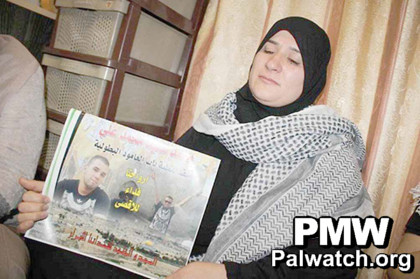 In the photo, the terrorist’s mother is holding a poster with a photo of her terrorist son with the text: “We are the sacrifice for the Al-Aqsa [Mosque] / Glory and immortality to our righteous Martyrs”