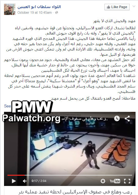 This is not the first time Abbas' advisor Abu Al-Einein glorifies terrorist murderers. When Palestinian Media Watch exposed Abu Al-Einein’s praise for another killer who stabbed a father of five to death, members of US Congress complained to PA Chairman Abbas, demanding he fire Abu Al-Einein. However, “peace-seeking” Abbas seems to be fine with his advisor’s glorification of killers of Israelis, as Sultan Abu Al-Einein is still at it, as this report shows.and Fatah Central Committee member Sultan Abu Al-Einein, Oct. 19, 2015]