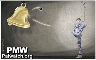 Drawing depicting a boy throwing a rock that hits a bell and causes it to ring, possibly indicating that rock throwing is a way to draw attention to the Palestinian cause.