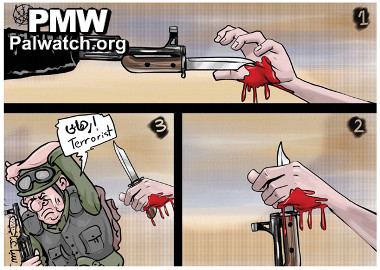 Director of PMW, Itamar Marcus, explains the three scenes in the cartoon as follows: “The cartoon claims that Israel victimizes Palestinians, framing them for the many recent stabbing attacks. [Scene 1] A knife attached to the end of the rifle of an Israeli soldier cuts the hand of a Palestinian. [Scene 2] The soldier withdraws the rifle, leaving the knife in the hand of the Palestinian, thus making it look like the Palestinian is the one attacking the soldier with the knife. [Scene 3] The soldier then shouts: ‘Terrorist!’”