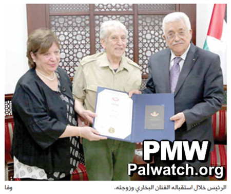 “The president [Abbas] awarded the Order of Merit for Culture, Sciences and Arts to the creator and artist Al-Bukhari in recognition of his creative path in plastic arts and cartoons, and out of recognition of his life full of giving, actions, struggle, and beauty, in a way that fits Palestine and its resolute and full culture.”