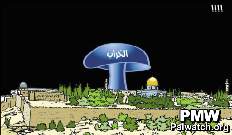 The mushroom in this cartoon represents the Hurva Synagogue, which was rebuilt and restored by Israel a few years ago in the Old City of Jerusalem. The cartoon depicts the synagogue overshadowing the Dome of the Rock. The Arabic text on the mushroom literally means "destruction," but can also be translated as "Hurva Synagogue."