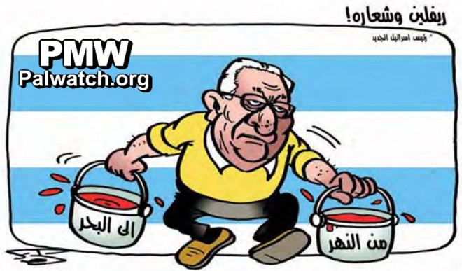 The cartoonist has presented Israeli President Reuven Rivlin as carrying what appears to be buckets of blood. The same cartoon adopted the PA’s libelous claim that the two stripes on the Israeli flag represent the Nile and the Euphrates or the Jordan River and the Mediterranean Sea, representing an alleged Jewish plan to establish “Greater Israel” ruling over all of “Palestine.”