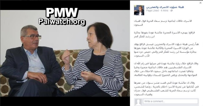 The picture shows PLO Commission of Prisoners’ Affairs Director Issa Karake sitting with released terrorist Aisha Odeh at her home in Ramallah.