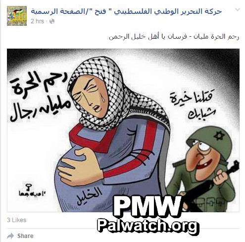 Fatah Facebook cartoon shows soldier saying to a Palestinian woman: “We have killed the best of your youth.”