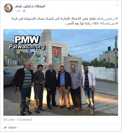 Posted text: “Dr. Laila Ghannam gets an update regarding the construction of Al-Shuhada Square (i.e., The Square of the Martyrs) in the village of Deir Ghasana (north-west of Ramallah) during a visit she made yesterday [Oct. 28, 2015].” In the square, behind Ghannam and others is a sculpture, the left of which is the shape of the map of “Palestine,” including both the PA areas and all of Israel.