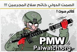Cartoon shows an Israeli soldier with bloody hands putting a silencer on his rifle.
