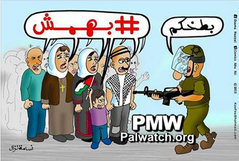 This cartoon illustrates the idea that Palestinians don't care about anything Israel does - #so_what!? A soldier points a machine gun at a group of Palestinians, saying: "I will shoot you." The Palestinians reply: "#so_what" [Website of Fatah's Information and Culture Commission, Nov. 8, 2015]