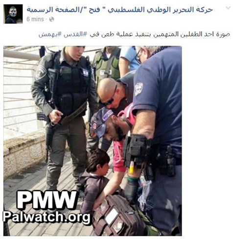 Fatah also used the #so_what following the stabbing attack today carried out by a 12-year-old Palestinian in Jerusalem. A photo from the boy's arrest appeared on Fatah's Facebook with the text "A photo of one of the boys accused of carrying out a stabbing operation (i.e., attack) in Jerusalem. #so_what" [Official Facebook page of the Fatah Movement, Nov. 10, 2015] Click to view PMW's documentation of PA and Fatah messages during the current terror campaign.