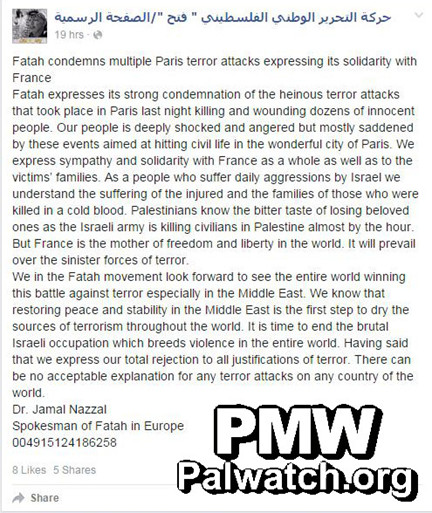 WAFA, the official PA news agency, reported that PA Chairman Abbas had “condemn[ed] what he described as 'terror attacks, affirming his full support for France in face of terrorism and stressing the need for the international community to take a stand and confront such terrorist attacks that lead to a spike in tension.’” [WAFA, Nov. 14, 2015] It then repeated the statement above by Fatah condemning the attacks and vilifying Israel.