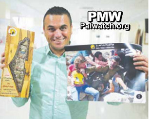The picture shows Issam Al-Riwami holding a plaque in the shape of a map of “Palestine” that includes the PA areas as well as all of Israel.
