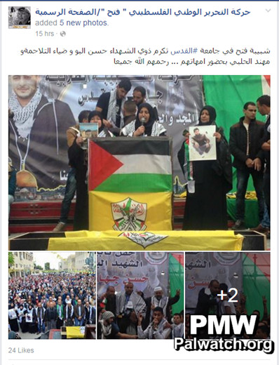 Text above picture: “Fatah Shabiba at Al-Quds University honors the relatives of Martyrs Hassan Al-Baw, Diya Al-Talahmeh, and Muhannad Halabi in the presence of their mothers. May Allah have mercy on all of them.”