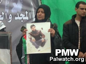 The main photo shows terrorist murderer Muhannad Halabi’s mother on the right, holding his picture.