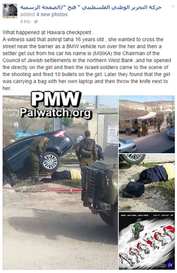 A witness said that ashrqt taha 16 years old , she wanted to cross the street near the barrier as a BMW vehicle run over the her and then a settler get out from his car his name is (MSIKA) the Chairman of the Council of Jewish settlements in the northern West Bank ,and he opened fire directly on the girl and then the Israeli soldiers came to the scene of the shooting and fired 10 bullets on the girl, Later they found that the girl was carrying a bag with her own laptop and then throw the knife next to her..” (sic., exactly as posted to Facebook)