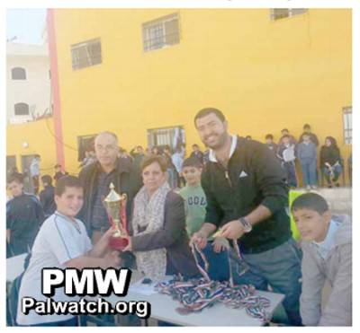 Headline: “Al-Khatib School’s team won the football tournament named after prisoner Manasrah (i.e., terrorist who stabbed two)”“The Al-Khatib School’s team won the Ahmad Manasrah Football Tournament, which was held two days ago [Nov. 21, 2015] on the sport fields of the Dar Al-Maarefa [Boys’] School in El-Bireh, in which many schools from the Ramallah and El-Bireh district participated.”
