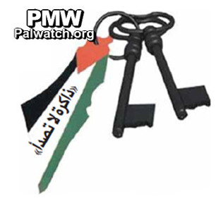 Image in the official PA daily shows a key ring with two keys, symbolizing keys to homes abandoned by Palestinians in 1948, and a map of “Palestine” that includes the PA areas as well as all of Israel, in the colors of the Palestinian flag, with the text: "A memory that never rusts"