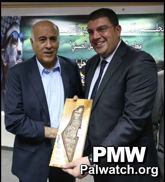 The pictures show Deputy Secretary of the Fatah Central Committee and Head of the Supreme Council for Sport and Youth Affairs Jibril Rajoub awarding plaques with the map of “Palestine” that includes both the PA areas and all of Israel.