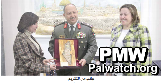 The photo shows Military Liaison Commissioner Jihad Jayousi holding a plaque with a map that includes the PA areas as well as all of Israel.