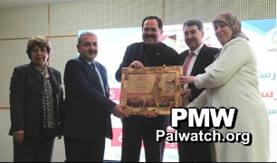 The Facebook page of the PA Ministry of Education posted several photos from an event for the launch of a project called Smart School. One of the photos shows PA Minister of Education and Higher Education Sabri Saidam holding a certificate of appreciation which shows a map of “Palestine” that includes the PA areas as well as all of Israel. District Governor of Ramallah and El-Bireh Laila Ghannam also appears in the picture. It is unclear who awarded the certificate to whom, and for what purpose.