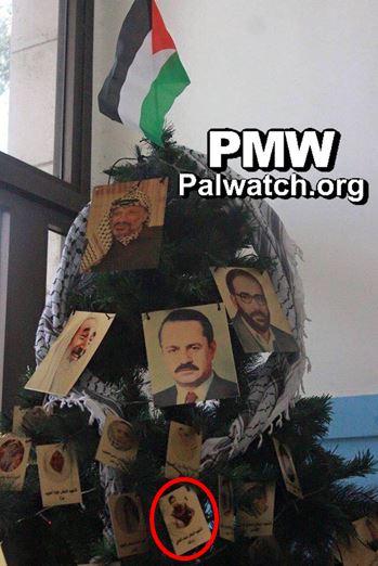 As its contribution to the Christmas spirit at Birzeit University near Ramallah, Fatah’s student movement Shabiba decorated a Christmas tree with pictures of “Martyrs” - among them terrorist murderer Muhannad Halabi who recently stabbed and killed two Israeli civilians in Jerusalem.