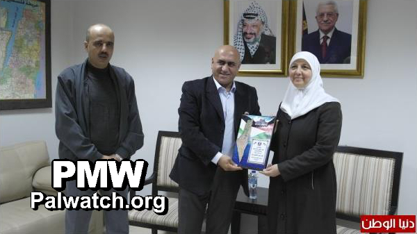 Prizewinning Nablus teacher by Palestinian Authority district governor honored with plaque shaped like map of "Palestine" erasing Israel
