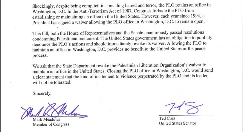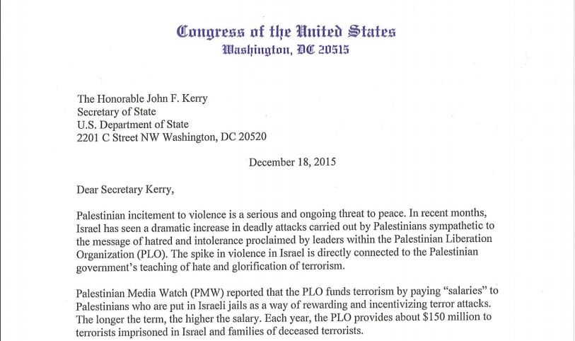 On Dec. 18, 2015, Congressman Mark Meadows and Senator Ted Cruz sent a letter to Secretary of State John Kerry demanding that he close down the PLO office in Washington. The letter was based on PMW documentation that the PLO pays salaries to Palestinian terrorists serving time in Israeli prisons. 32 members of congress signed the letter.