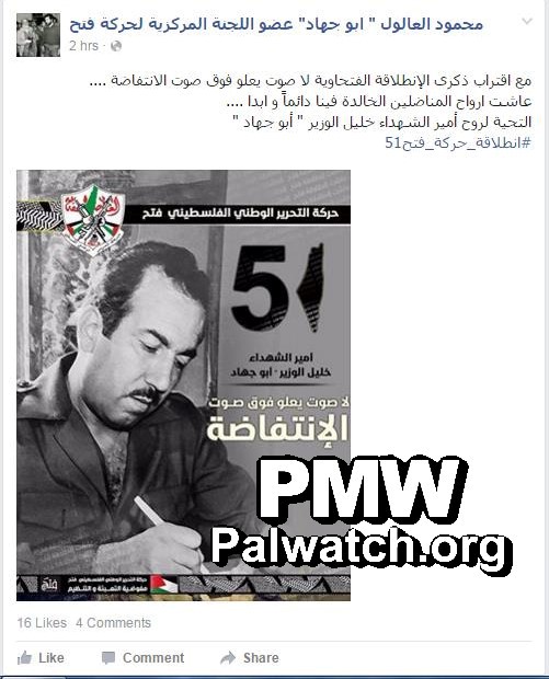 Fatah official blesses Abu Jihad, arch terrorist responsible for killing 125, on his Facebook page