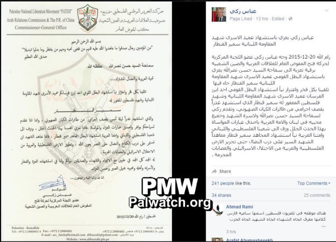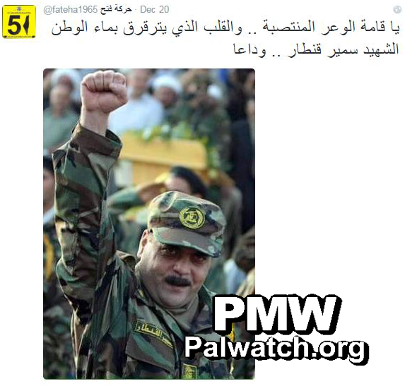 “Fatah Central Committee member [and former head of the PA General Intelligence] Tawfiq Tirawi, condemned yesterday [Dec. 20, 2015] in an announcement, the assassination of fighter leader, released prisoner Samir Kuntar in an Israeli airstrike on the outskirts of Damascus , where he was staying. Tirawi stated that this heinous crime is added to the history of terror by the Israeli occupation state, which insists on continuing with the killing and destruction anywhere it pleases.