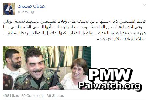 Posted text: “Palestine loves you as you loved it. None of us doubts your loyalty to Palestine, a Martyr (Shahid) as big as the homeland. You are loyal, and we Palestinians are loyal. Peace be upon your soul, O Palestinian Arab, O he who lived among us and we lived alongside him. The details of agony are also the details of the struggle. Peace be upon your soul, peace to Lebanon and peace to the south [of Lebanon].”