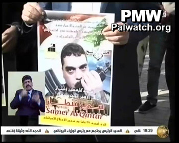 Official PA TV reporter: “Martyr (Shahid) Samir Kuntar was born in 1962 in the village of Abey on Mount Lebanon, joined the Palestine Liberation Front when he was 14 years old, and joined its training camps, and created for himself a history of unrelenting struggle. Kuntar spent 28 (sic., 29) years in Israeli prison, after he carried out an operation (i.e., terror attack) in 1979, meant to kidnap Israeli soldiers in the settlement (i.e., city) of Nahariya, in order to exchange them for fighters held in Israeli prison.”