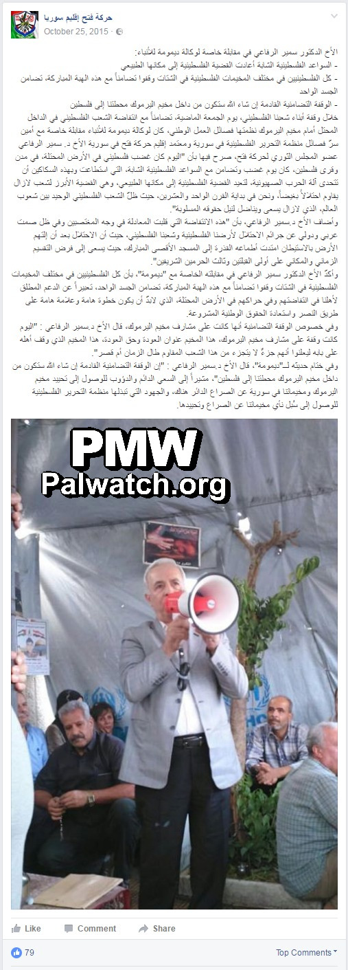 “During the solidarity vigil of members of our Palestinian people with the Palestinian people’s intifada (Palestinian euphemism for several months of Palestinian terror attacks against Israelis 2015 - 2016 -Ed.) in the occupied Interior (i.e., Palestinian term for Israel) in front of the Al-Yarmouk refugee camp last Friday [Dec. 18, 2015], which was organized by factions of the national activity, the [independent Palestinian] news agency Daymomah held an exclusive interview with Secretary of the PLO factions in Syria and Supervisor of the Fatah Movement Branch in Syria and Fatah Revolutionary Council member Dr. Samir Al-Rifai .