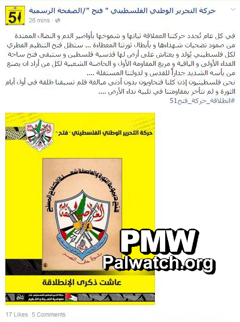 Posted text: “Every year, our mighty movement renews its steadiness and uprightness through blood connections and the struggle, which extend from the firm sacrifice of its Martyrs (Shahids) and the heroes of our generous revolution. Fatah will continue to be the natural organization of every Palestinian who was born and lives on the sacred land of Palestine. Moreover, Fatah will remain the foremost and eternal arena of self-sacrifice, the first circle of resistance, and a popular incubator for anyone who wishes to turn their intense misery into a wall for Jerusalem and our independent state. We are Palestinians, and therefore, without any exaggeration, we are all Fatah people, no shooting preceded us in the first days of the revolution (i.e., Fatah were the first to take up arms against Israel), and it won’t take us long to answer the call of the land and to carry out our resistance.”