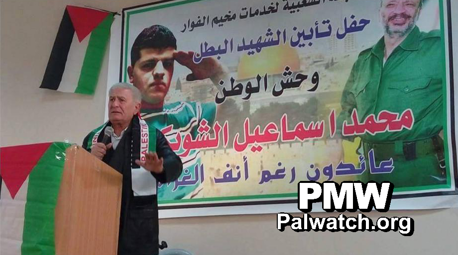 Picture shows Fatah Central Committee Member and Commissioner of Arab Relations and Relations with China Abbas Zaki giving a speech at the funeral ceremony in honor of terrorist Muhammad Al-Shubaki who stabbed and wounded an Israeli soldier.
