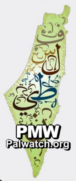 The image shows the PA’s map of “Palestine” that includes the PA areas as well as all of Israel. The letters of the word “Palestine” are written on the map.
