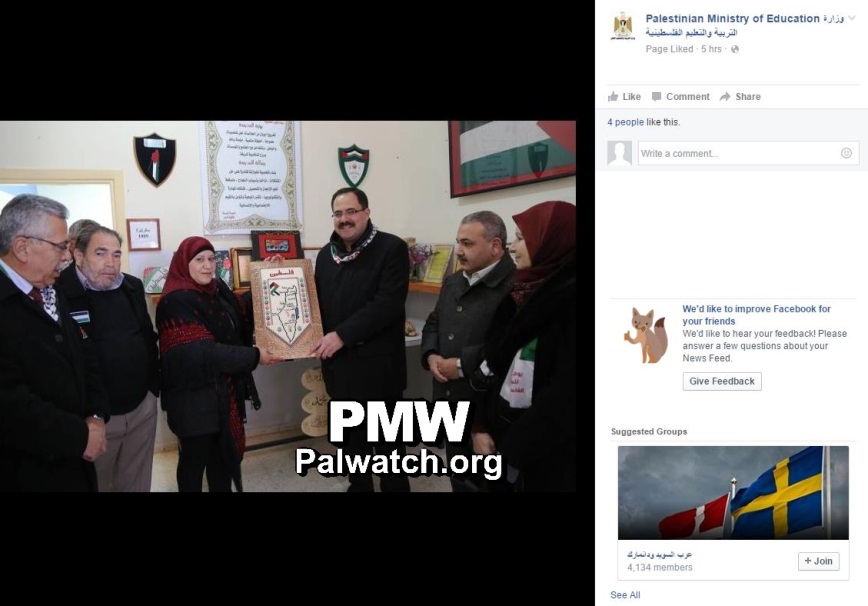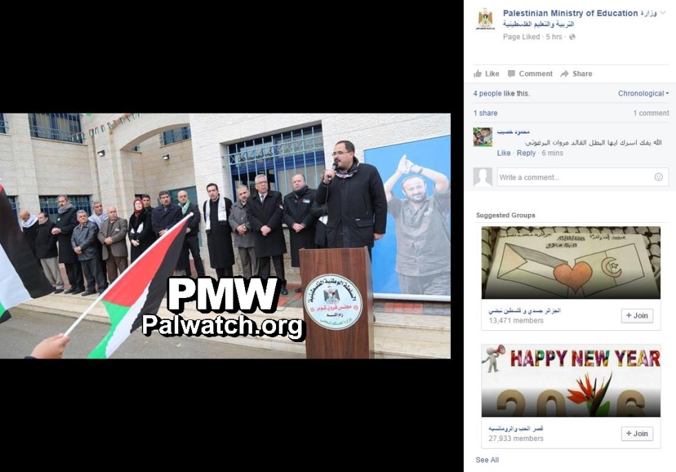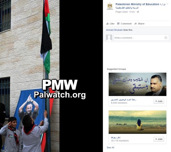 Posted text: “The schools in the State of Palestine have raised the Palestinian flag this morning [Jan. 3, 2015] in response to the [PA] Ministry of Education and Higher Education’s call to commemorate [Palestinian ] flag day in schools on this day every year… In order to emphasize the flag’s status as a symbol of sovereignty, independence, and freedom, Minister of Education and Higher Education Sabri Saidam participated this morning, together with students of schools in [the village of] Kobar, which are subordinated to the Ramallah and El-Bireh Education Administration, in the ‘flag day’ events in the schools... In his speech, Saidam emphasized that cherishing the Palestinian flag in the homeland’s schools demonstrates the inculcation of noble values and ideas in the young souls, and the loyalty to the blood of the Martyrs (Shahids), the struggle of the prisoners and the sacrifices of the wounded. He also praised the residents of the village of Kobar, and mentioned the prisoner leader [Palestinian Parliament Member] Marwan Barghouti, who serves time in the occupation’s prison camps for the freedom and honor of our people and the young generations.”