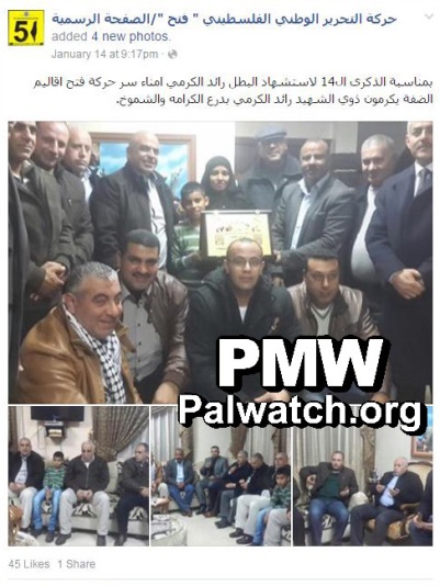 “On the occasion of the 14th anniversary of the hero Raed Karmi’s death as a Martyr (Shahid), the secretaries of the Fatah branches in the West Bank honored Martyr Raed Karmi’s family with a plaque of honor and glory.”