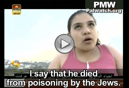 Palestinian Media Watch has documented that Palestinian children believe this libel and that the PA wants to reinforce it. Several years in a row, PA TV broadcast a video showing Palestinian kids talking about Arafat, including many statements of hate speech against Jews in which the children repeated that “the Jews killed Arafat”: