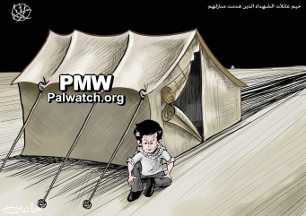 The cartoon shows a tent with a boy sitting in front of it. Its flaps are opened in a way that the opening takes on the shape of a map of "Palestine" that includes the PA areas as well as all of Israel. “Homes destroyed” refers to Israel’s demolition of homes belonging to terrorists who carried out attacks against Israelis.