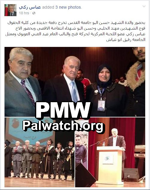 Posted text: "In the presence of Martyr Hassan Albo, the Al-Quds University graduated a new class of graduates of the faculty of law – the class of Martyrs (Shahids) Muhannad Halabi and Hassan Albo, Martyrs of the Al-Aqsa Intifada. In addition, Fatah Central Committee member Abbas Zaki, Attorney General Abd Al-Ghani Al-Aweewi, and university representative Rafiq Abu Ayyash were present."