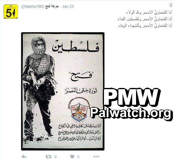 Fatah tweets image encourages violence and death: "Carry my weapon and do not fear my blood dripping from the weapon"