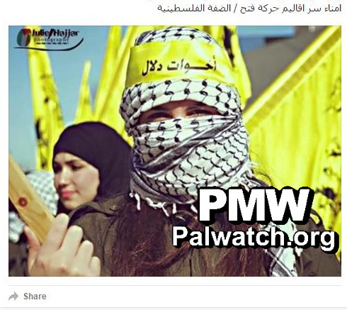 Photo shows masked woman with a headband of Fatah’s committee at Palestinian universities, the “Sisters of Dalal” – a reference to terrorist Dalal Mughrabi who led the most lethal terror attack in Israel’s history, known as the Coastal Road massacre, in 1978, when she and other Fatah terrorists hijacked a bus on Israel's Coastal Highway, killing 37 civilians, 12 of them children, and wounding over 70.