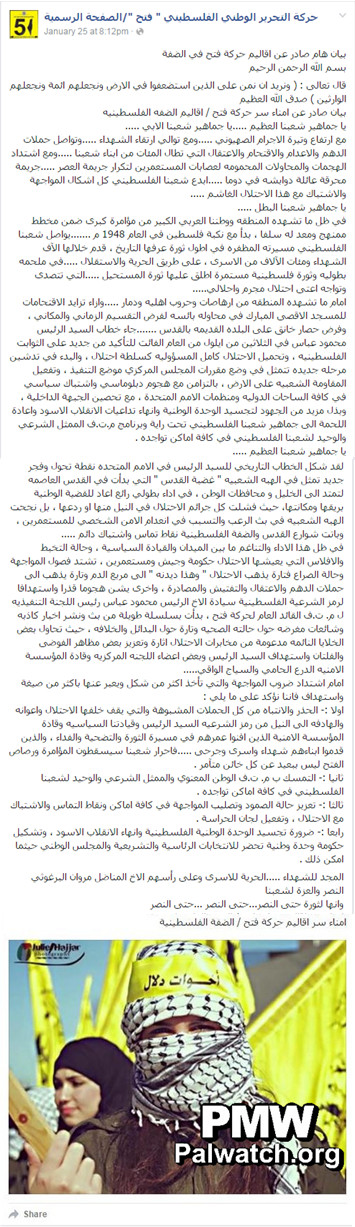 Photo and text posted on the official Facebook page of the Fatah Movement on Jan. 25, 2016