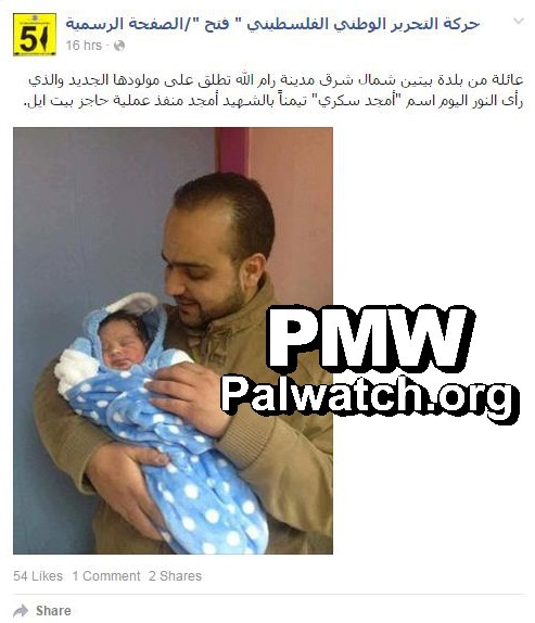 Posted text: “A family from the village of Beitin, northeast of Ramallah, named its newborn son that was born today [Feb. 1, 2016] Amjad Sukkari, after Martyr (Shahid) Amjad, who carried out the Beit-El checkpoint operation (i.e., terror attack).