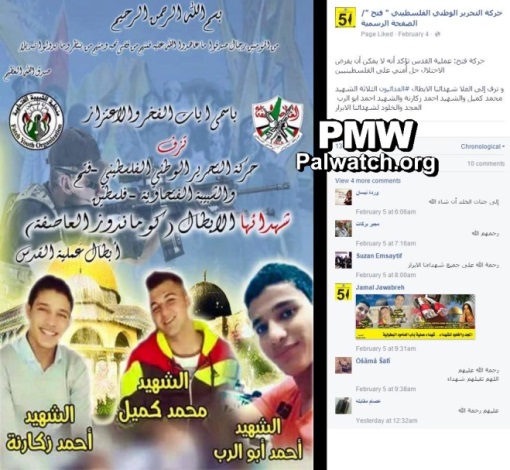[Fatah] accompanies to Paradise its heroic Martyrs (Shahids), the three self-sacrificing fighters (Fedayeen), Martyr Muhammad Kmeil, Martyr Ahmad Zakarneh, and Martyr Ahmad Abu Al-Rub. Eternity and glory to our righteous Martyrs."