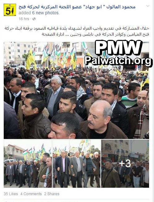 The official Facebook page of Fatah Central Committee member Mahmoud Al-Aloul reports on a Fatah procession to console the families of three terrorists from Qabatiya who killed Israeli policewoman Hadar Cohen on Feb. 3, 2016 at the Damascus Gate in the Old City of Jerusalem. Fatah Commissioner for Diaspora Branches and Fatah Central Committee member Jamal Muhaisen and Fatah Commissioner for Mobilization and Organization and Fatah Central Committee member Mahmoud Al-Aloul participated in the procession.